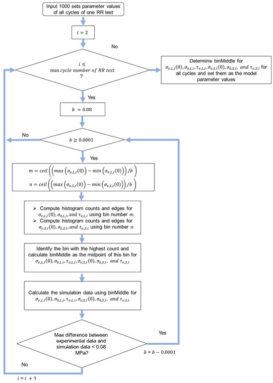 From Figure 2b, the experimental data of the NPR specimen show no plateau region but only a peak; hence, a novel peak-point method was developed for the determination of the model parameter values of NPR specimens. The flow chart in Figure 6 depicts the programming of the peak-point method for the parameter value identification in the relaxation stages of the RR tests. Similarly, Equation (1) was used to fit the relaxation data, and all the fitting parameter values in the relaxation stages were obtained. values were calculated using the same method from the mode method. From Figure 6, the ranges of and values were determined using their peak points. The peak point was assumed to be at the same stroke of the peak point of . Because 30 cycles of the RR test for the NPR specimen were collected, 30 was used in the flow chart in Figure 6. The algorithm in Figure 5 was also used to search for the optimal fitting parameter values, but value 0.08 in Figure 5 was changed to be 0.1. Therefore, the maximum difference between experimental data and simulation data from the results using the peak-point method was less than 0.1 MPa. The ranges of the boundaries used in Figure 6 are shown in the Supplementary Materials.