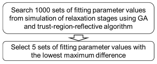 The best-five-fits method can also be found in our previous work. Figure 10 shows the algorithm for this method. Similarly, 1000 sets of fitting parameter values were first determined using the method shown in Figure 8. Then, the five sets of fitting parameter values with the lowest maximum difference between experimental data and simulation data were selected. Therefore, this method can provide model parameter values with high accuracy for the simulation, that is, the maximum difference between experimental data and simulation data is less than 0.08 MPa.