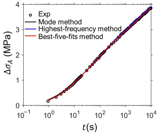 For the simulation of nonlinear stress relaxation, multiple solutions exist for the model parameter values of the three-branch model. In the previous work, 10 sets of model parameter values of HDPE for the PE100 pipe were determined using the mode method [27]. Then, the best-five-fits method was proposed, which was applied to the determination of the model parameter values of HDPE, PE-Xa pipe, PE4710-yellow pipe, PE4710-black pipe, and PE2708 pipe in the previous work [28]. In this paper, the novel peak-point method and highest-frequency method were proposed. Therefore, the four methods are summarized in this section and were used to analyze the data for the comparison in this paper. In addition, the programming of the four methods was developed using MATLAB 2024a.