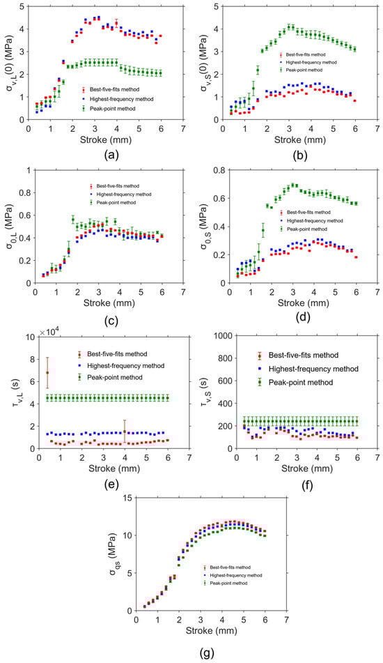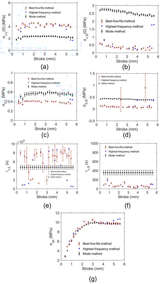 From Figure 12c, values from the best-five-fits method and highest-frequency method are much smaller than those determined from the mode method at the same deformation level, and a similar pattern can also be found for the values in Figure 12d. values from the highest-frequency method vary sharply from 0 mm to 1 mm and fluctuate after 1 mm. From the best-five-fits method and highest-frequency method, values are lower than values at most deformation levels. values from the highest-frequency method are almost constant during deformation. From Figure 12e, values from the best-five-fits method and highest-frequency method are scattering during deformation. It was reported that that inaccurate values for the characteristic relaxation time have a minor influence on the simulation [28]. Therefore, the scattering values may be caused by their sensitivity in the simulation. Figure 12f shows values from the best-five-fits method and highest-frequency method are lower than those from the mode method. values and values from the highest-frequency method vary during deformation. Figure 12g indicates that the values from the mode method, best-five-fits method, and highest-frequency method are close. In addition, the standard deviation for values determined by the mode method and best-five-fits method is quite small.