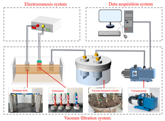 ② To achieve deep dehydration of waste mud, the author used a self-designed experimental device (as shown in Figure 1) to conduct the test of vacuum filtration combined with electroosmosis dehydration on the flocculated mud. The device mainly includes a vacuum filtration system, an electroosmosis system, and a data acquisition system, and it can simulate the dehydration effect of mud under different vacuum filtration and electroosmosis by controlling the DC power supply.