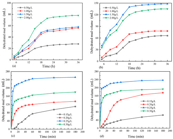It can be seen from Figure 4c,d that the dewatering process of waste mud under the action of organic flocculants can also be divided into three stages. The rapid dewatering of the waste mud occurs in the first 10 min of the entire process. After adding the flocculant to the mud, the polymer chains rapidly stretch in the water under the repulsive force of the -COO- group, and then the mud and water are rapidly separated. The dehydration effect at this stage is closely related to the concentration of the flocculant. The period from 10 to 60 min is the flocculation and compaction stage of the mud, during which the rate of mud–water separation gradually slows down. The main reason for this phenomenon is that organic flocculants contain a large number of polar groups with strong adsorption capacity. These groups cause the fine clay particles to coagulate into a network structure through adsorption. These flocculants separate from water molecules under the effect of their own weight, thereby achieving the purpose of dehydration. The dehydrated mud volume remained stable after 60 min.