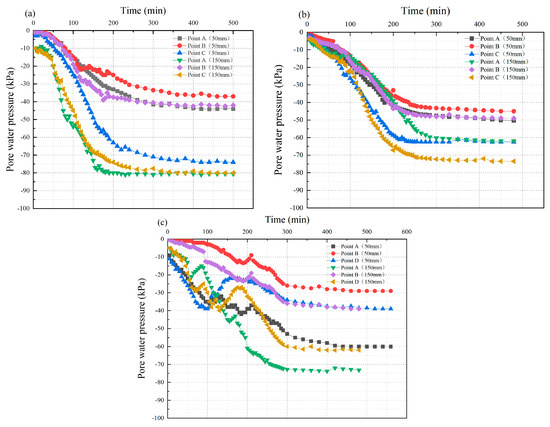 By comparing the variation curves of pore water pressure of the flocculated mud under the different test conditions, it can be found that the dissipation rate of flocculated mud pore water pressure gradually decreases with the increase in the radial distance and vertical depth of the discharge water body. This phenomenon may be attributed to the influence that the drainage effect is constrained by the vacuum transfer boundary conditions. With the increase in the vertical depth of the drainage body, the density of the flocculated mud further decreases. The decline in the permeability of the mud hinders the effective discharge of pore water.