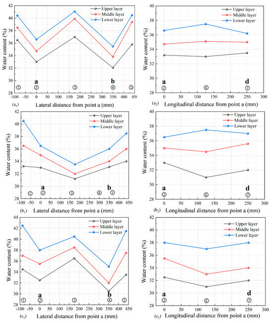 The distribution curve of flocculated mud sediment water content: (a1,a2) ZD1, (b1,b2) ZD2, (c1,c2) ZD3. ①–⑦ are the sampling positions set according to the test protocol. (a,b,d) correspond respectively to the distribution positions of the drainage bodies.