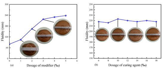 The curve of solidified soil fluidity vs. additives dosage: (a) modifier; (b) curing agent.