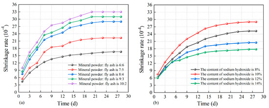 The curve of solidified soil self-shrinkage vs. additives dosage: (a) granulated blast furnace slag; (b) sodium hydroxide.