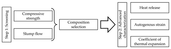 The present study explores the use of limestone filler as a partial substitution of slag in order to attempt to mitigate the volume changes. This research was conducted in two parts (see Figure 1). The first part consists of a preliminary campaign followed by an in-depth testing campaign. The preliminary phase serves as a selection process in which a range of compositions are proposed and evaluated in terms of workability and compressive strength performance. These compositions were chosen based on a literature review and examine the replacement of blast-furnace slag with limestone filler (LF) at various percentages. Ultimately, five compositions were selected for further detailed investigation in the second part where the reaction kinetics, the autogenous strain, and the thermal strains are studied.