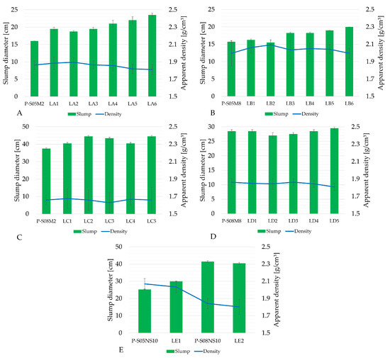 Results of the apparent density and the slump of alkali-activated slag with LF substitution: (A) P-S05M2 as reference (category A), (B) P-S05M8 as reference (category B), (C) P-S08M2 as reference (category C), (D) P-S08M8 as reference (category D), (E) sodium silicate reference compositions (category E).