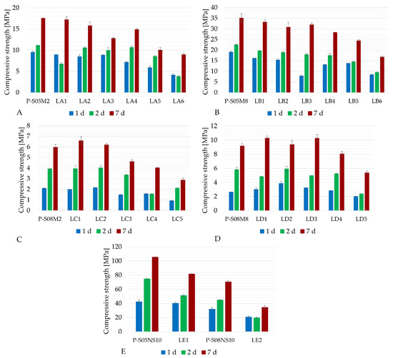 Compressive strength results of alkali-activated slag with LF substitution: (A) P-S05M2 as reference (category A), (B) P-S05M8 as reference (category B), (C) P-S08M2 as reference (category C), (D) P-S08M8 as reference (category D), (E) sodium silicate reference compositions (category E).