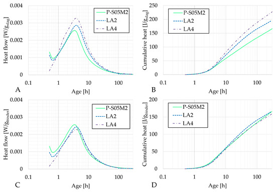 Results of the reaction kinetics followed through isothermal calorimetry for P-S05M2, LA2 and LA4: (A) Heat flow and (B) cumulative heat presented per gram of slag; (C) Heat flow and (D) cumulative heat presented per gram of binder (=limestone filler+slag).