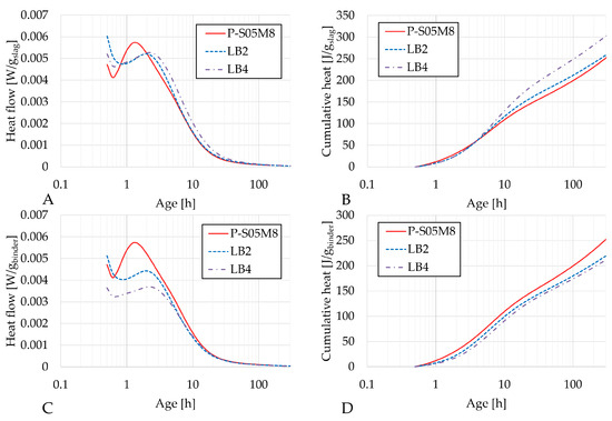 Results of the reaction kinetics followed through isothermal calorimetry for P-S05M8, LB2 and LB4: (A) Heat flow and (B) cumulative heat presented per gram of slag; (C) Heat flow and (D) cumulative heat presented per gram of binder (=limestone filler+slag).