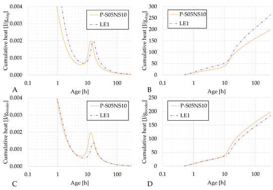 Results of the reaction kinetics followed through isothermal calorimetry for P-S05NS10 and LE1: (A) Heat flow and (B) cumulative heat presented per gram of slag; (C) Heat flow and (D) cumulative heat presented per gram of binder (=limestone filler+slag).