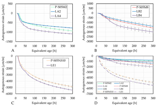 Autogenous strains as a function of the age: (A) P-S05M2 reference composition, (B) P-S05M8 reference composition, (C) P-S05NS10 reference composition, (D) Summary of all curves.