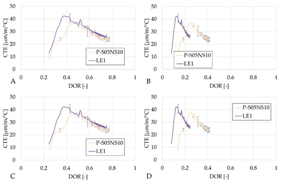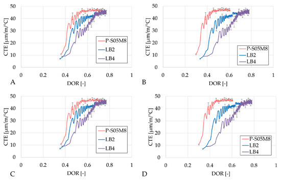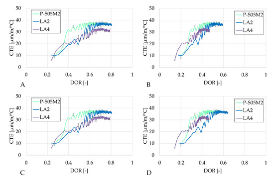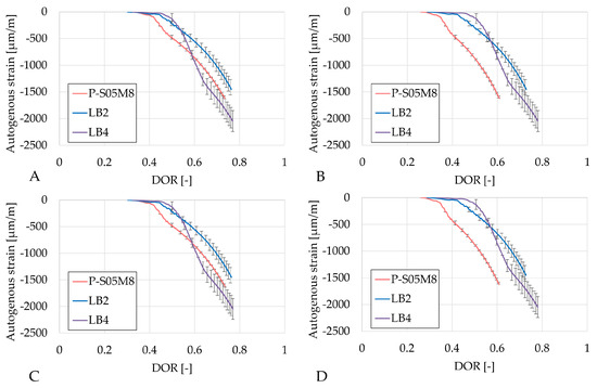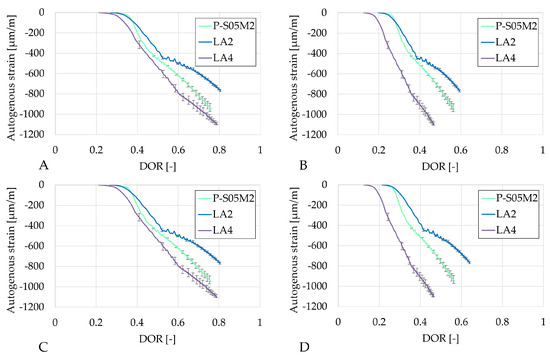 Figure 8 presents the autogenous strain as a function of the degree of reaction computed using the four ultimate heat values obtained in Table 6. The results based on the same methods are very similar. In each case, LA4 evolves the fastest with respect to the degree of reaction. Both compositions with limestone filler exhibit a change in rate (around DOR = 0.5 for LA2 and DOR = 0.6 for LA4, in Figure 8A), whereas the reference composition does not show such a distinct transition. After this point, the rate of autogenous shrinkage is reduced with respect to the rate in the reference composition.
