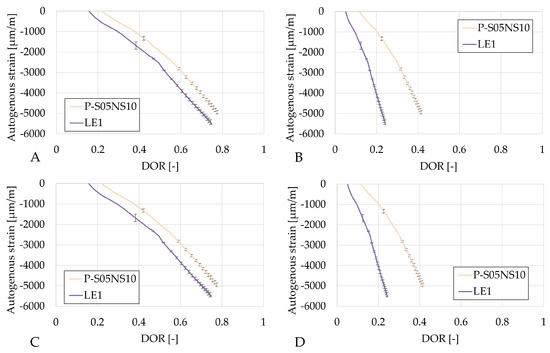 Figure 7 compares the autogenous strain of each composition relative to the reference compositions, with respect to the age. The autogenous strain curves were initialized based on the knee-point method. Time zero corresponds to the age at which the rate of autogenous strain reaches zero [56] or when it reaches its maximum in the case it does not reach zero [6]. This point corresponds to the solid-to-fluid state transition. Each initialization age as well as the corresponding DOR (calculated with the ultimate heats obtained in Table 6) is shown in Table 7.