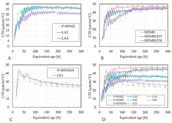 At very early ages, decoupling these strains was necessary. However, after a certain period, the autogenous strain stabilized over short intervals of time, allowing for CTE calculations within those periods [43]. Because of how the procedure was established, the computations of both strains were performed about every two hours.