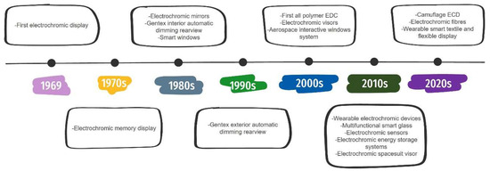 The evolution of electrochromic devices from single functionality to flexible and integrated systems. First electrochromic display [100] in 1969; electrochromic memory display [101] in the 1970s; electrochromic mirrors [102], Gentex interior automatic dimming rearview [103] and Smart windows [104,105] in the 1980s; Gentex exterior automatic dimming rearview mirror [103] in the 1990s; first, all polymer ECD [106], Electrochromic visors [107], Aerospace Interactive Window Systems [108] in the 2000s; wearable electrochromic devices [35], Multifunctional smart glass [109], Electrochromic sensors [20,21,110], Electrochromic energy storage systems [111], Electrochromic space suit visor [112] in the 2010s; camouflage ECD [25,36], Electrochromic fibres [37,113], wearable smart textile and flexible display [114] in the 2020s.