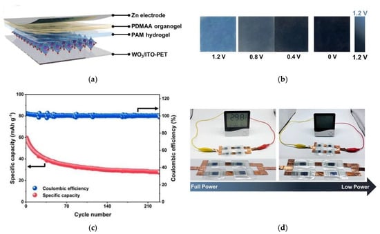 - Ai, X.; Zhao, Q.; Duan, Y.; Chen, Z.; Zhang, Z.; Liu, Y.; Gao, Y. Zinc polyacrylamide hydrogel electrolyte for quasi-solid-state electrochromic devices with low-temperature tolerance. Cell Rep. Phys. Sci. 2022, 3, 101148. [Google Scholar] [CrossRef]