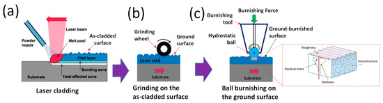 The proposed grinding–burnishing strategy applied on laser metal deposited Stellite 21 alloy: (a) laser cladding, (b) grinding on cladded surface, and (c) burnishing on ground surface.