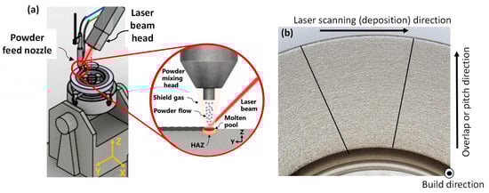 (a) Illustration of laser metal deposition of Stellite 21 alloy annular disc, and (b) cut section of the deposited block showing laser scanning, overlap or pitch and build directions.