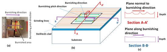 Comparison of residual stress with respect to distance along depth induced by grinding and burnishing along (a) the burnishing direction () on B-B’ plane and (b) normal to the burnishing direction () on A-A’ plane. Right side images in (a,b) depict an illustration of burnishing path and stress measurement directions.