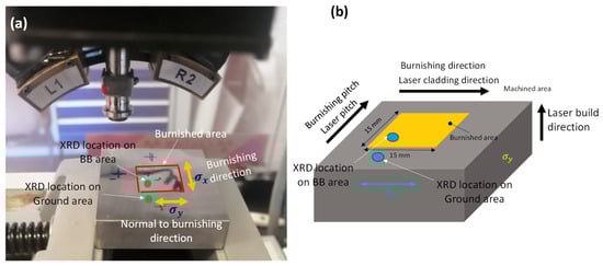 Residual stress was measured on the ground and burnished specimens using Proto’s iXRD system. Figure 5 shows an XRD experimental setup indicating the location of measurement on the sample. Residual stress measurements were conducted on both burnishing () and normal to burnishing () directions. Table 3 summarises residual stress measurement parameters used in this study.