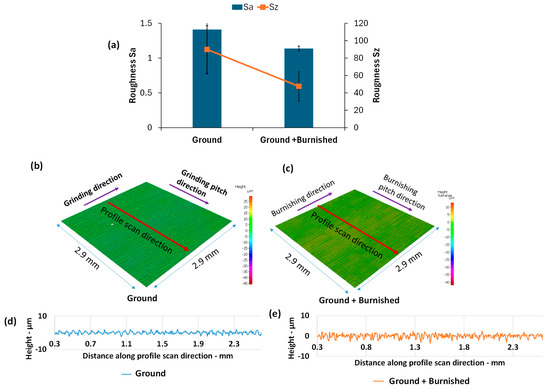 Comparison of surface roughness (a) Sa and Sz, (b,c) 3D surface topography, and (d,e) roughness profile between Ground and Ground + Burnished specimens.