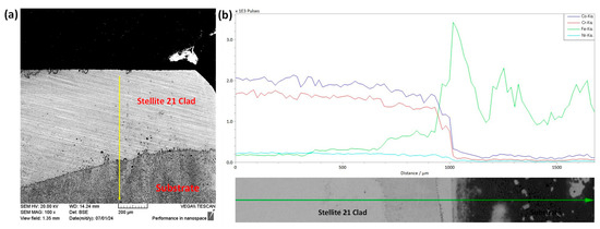 SEM and EDS analyses were conducted on the interface between the Stellite 21 coating and the G250 substrate. As shown in Figure 7, a high concentration of Co and Cr elements was observed in the cladded layer, while Fe was predominantly detected in the substrate. These observations further confirm the successful laser direct energy deposition of the Stellite 21 coating with the desired elemental compositions.