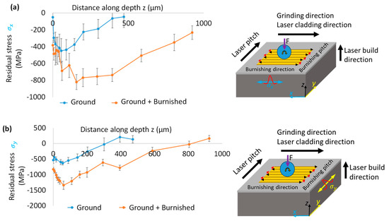 Figure 11 compares the residual stress along the burnishing direction (σx) on the B-B’ plane and perpendicular to the burnishing direction (σγ) on the A-A’ plane. As shown in Figure 11a, the residual stress σx after grinding and burnishing exhibits compressive behavior from the top surface to the depth. For the ground surface, the maximum compressive stress of −449 MPa occurs at a depth of 56 µm from the top surface, gradually transitioning to nearly tensile stress at a depth of 471 µm. In contrast, after burnishing, the residual stress σx remains compressive from the top surface, reaching a maximum of −821 MPa at a greater depth of 157 µm. From this point, the magnitude of compressive stress decays, with the compressive stress layer extending as deep as 924 µm. While grinding induced compressive stress, the burnishing produced a significantly higher and deeper compressive stress layer within the cladding.