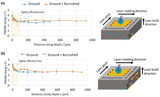 Comparison of FWHM with respect to distance along depth induced by grinding and burnishing along (a) the burnishing direction (x) on B-B’ plane and (b) normal to burnishing direction (y) on A-A’ plane. Images on right side in (a,b) show an illustration of burnishing path and XRD FWHM peak measurement directions.
