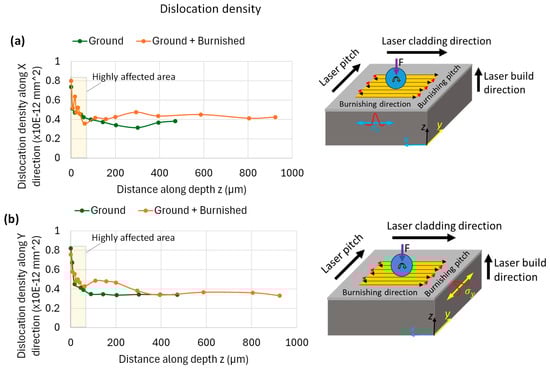 Further, based on the FWHM data, the dislocation density along the depth from the tip surface for both ground and burnished specimens was estimated using the Modified Williamson-Hall method [24]. Figure 13 compares the dislocation density along the x-axis (along burnishing direction) and along y-axis (perpendicular to the burnishing direction). As can be seen from Figure 13, the dislocation density follows the similar trend of FWHM. The burnishing increased the dislocation density over the ground specimen. In particular, the density location density along y-axis or along normal to the burnishing direction (on A-A’ plane) is significant and higher beyond 60 µm depth below the top surface, as compared to that along x-axis or along the burnishing direction (on B-B’ plane). For instance, at 100 µm depth, the dislocation density along x-axis is 0.41 × 10−12 mm2 while that along y-axis is 0.48 × 10−12 mm2. The dislocation density is associated with hardness, i.e., higher dislocation means higher hardness.