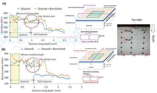 Comparison of microhardness on cross-sectional surfaces cut (a) along burnishing direction on B-B’ plane and (b) along normal to burnishing on A-A’ plane, as illustrated in schematic diagrams next to the hardness plots. Light yellow boxes in (a,b) highlight the effective modified depth of hardened material layer due to burnishing while the red circles indicate the sudden hardness increase in heat affected zone near the interface between the substrate and Stellite 21 clad. Right side images indicate the cross-sectional planes on which the hardness was measured on the surface treated specimens.