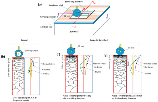 Illustration of plastically induced grain modification on the cross-section planes of the treated samples: (a) definition of cross-sectional planes; (b) ground sample A-A’ plane; (c) ground + burnished sample B-B’ plane (along the burnishing); and (d) ground + burnished sample A-A’ plane (normal to the burnishing direction or burnishing pitch direction).
