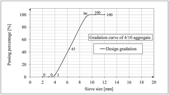 The scope of work covers the determination of the long-term mechanical properties of two lightweight concrete mixtures with a special ceramic, sintered aggregate (Certyd, Białystok, Poland). The sintered aggregate and the fresh concrete mix with this aggregate used in the work are shown in Figure 1. The aggregate used is a type of crushed aggregate with a fraction of 4/10. The manufacturer determined the percentage composition of the aggregate fraction by the screening method before it was allowed for testing, and the results were that 96% was a fraction smaller than 9 mm, 45% was smaller than 6.3 mm, and 3% was a fraction smaller than 4 mm. The dust content was 0.6%. In addition, the manufacturer provided the following information on the aggregate prepared for testing: bulk density: 654.9 kg/m3; crushing value: 6.5 Mpa; water absorption: 18.4% after 24 h; grain density: 1417 kg/m3. The design gradation curve of the 4/10 aggregate is shown in Figure 2.