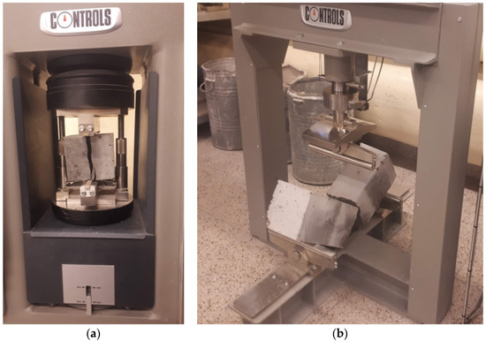 The tensile strength tests: (a) The device for testing tensile strength at splitting with the broken test specimen. (b) The device for testing bending strength with the broken test specimen.