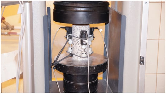 The LWAC was prepared in a concrete plant by using a specialized mixer (manufactured by Liebherr-Mischtechnik GmbH, Bad Schussenried, Germany), which guarantees the homogeneity of the mixture. The features of fresh mixes were tested in accordance with the relevant standards [55,56,57,58,59]. Two sample preparation methods were adopted: cylindrical samples were collected from core drillings made in an LWAC block, while cubic and prismatic samples were cast in molds. Tests on the axial tensile strength and creep of LWAC (due to the lack of standards or difficulties in their implementation) are rarely performed, and so far, there is a lack of reliable test results in this area. Therefore, ITB Instruction No. 194/98, among others, was used for this purpose [60]. Cylindrical samples were taken from core drillings with a nominal diameter of 94 mm. The samples were prepared for testing the following mechanical properties of lightweight concrete: