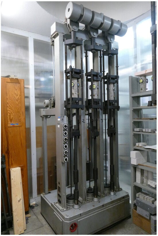 The basic devices used to test the mechanical properties of the considered lightweight concrete are presented below. The device used for the axial tensile strength tests, the sample after the test, and the fracture forms of the samples are shown in Figure 3a, Figure 3b, and Figure 3c, respectively. Figure 4a shows the apparatus for testing tensile strength at splitting and the sample split as a result of the test. The bending strength testing equipment and the sample broken as a result of the test is presented in Figure 4b. The device for testing the modulus of elasticity is shown in Figure 5. The last one is the creep-testing machine shown in Figure 6. The tests were carried out in accordance with the requirements of the relevant standards [55,56,57,58,59,61,62,63,64,65,66] and ITB Instruction No. 194/88 [60]. The testing equipment is in the first class of accuracy.