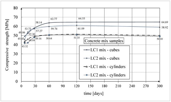 The test results of the compressive strength of cubical and cylindrical samples are shown in Figure 7. After 7 days from the preparation of the samples, the LC1 and LC2 concrete mixes obtained the LC 35/38 class according to [67] (see Figure 7). The numerical labels in the graphs refer to the cube strength and, in addition, in the case of the cylindrical strength, only to the results obtained from concrete samples for the LC1 mix due to overlapping graphs. At 28 days, these mixes achieved two following classes, finally reaching the LC 45/50 class according to [67] with the D1.8 density class.