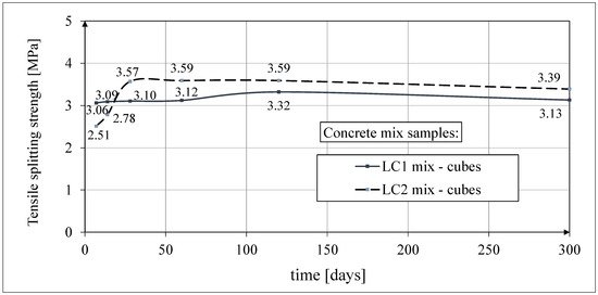 The splitting strength results for the LC1 mix over 60 days were fairly constant and these results for the LC2 mix increased by more than 40% between days 7 and 28. Tests of concrete tensile splitting strength were carried out each time on three typical cubic samples with dimensions of 150 × 150 × 150 mm in accordance with the standard [63]. The results of these tests up to 60 days of concrete age were previously published in the paper [52]. The test results of the tensile splitting strength of test specimens are given in Figure 8. The average values of the tensile strength of LC1 and LC2 concrete cube samples in the splitting test 28 days after sample production were 3.10 MPa and 3.57 MPa, respectively, with standard deviations of 0.18 MPa and 0.21 MPa, respectively.