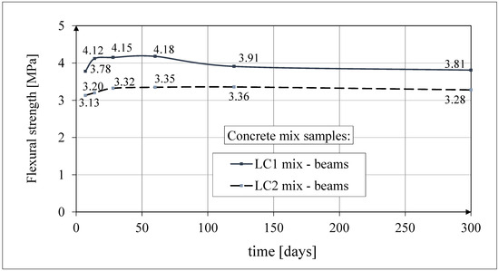 The flexural strength results for the LC2 concrete over 60 days were fairly constant, while those for the LC1 concrete increased by more than 10% between 7 and 28 days. The results of these tests up to 60 days of concrete age were published earlier in the paper [52]. The average values of the tensile strength of the LC1 and LC2 concrete samples in the flexural test 28 days after sample production were 4.15 MPa and 3.32 MPa, respectively, with standard deviations of 0.21 MPa in both cases.
