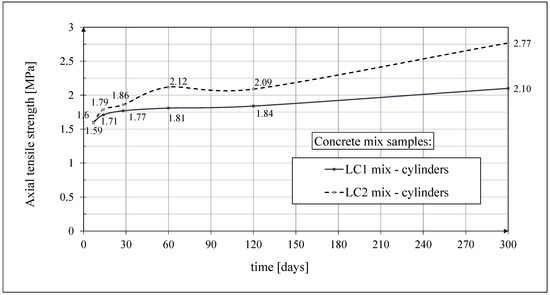 The test results of the development of the axial tensile strength of the LC1 and LC2 concretes according to ITB Instruction No. 194 [60] 14, 28, 60, 120, and 300 days after sample production are given in Figure 10. The axial tensile strength tests were performed on 3 cylindrical samples each time, except for the tests 28 days after casting, which represent average results from 10 samples. Samples with a diameter of d = 94 mm and a height of h = 190 mm were used, selecting samples with the same cross-section as those intended for the creep tests (and accompanying shrinkage tests). Seven days after sample preparation, the LC1 and LC2 concretes reached an average axial tensile strength of approximately 1.6 MPa (see Figure 10). After 28 days, the strength increased by more than 10%. The results of these tests up to 60 days of concrete age were published in the works [52,53]. In both cases, the axial tensile strength of LC1 and LC2 cylindrical concrete samples was determined after 28 days from sample production. The average values of this strength were 1.77 MPa and 1.86 MPa, respectively, and the standard deviations were 0.57 MPa and 0.34 MPa, respectively.