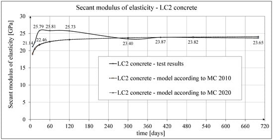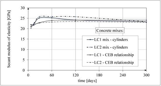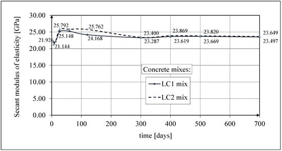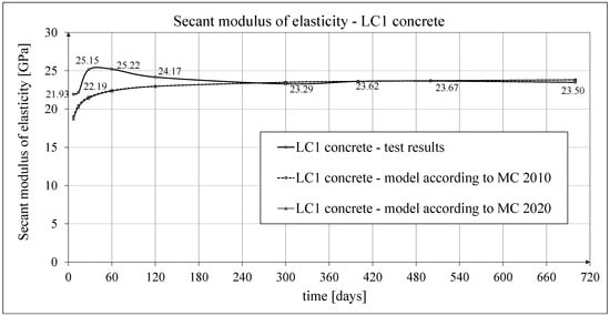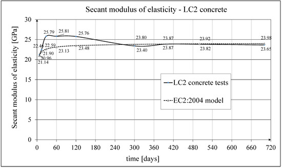 The results of the tests of the secant modulus of elasticity of concrete are shown in Figure 11. The results of the tests up to 60 days of concrete age were published in the works [52,53]. The tests of the secant modulus of elasticity of concrete in compression were carried out according to the standard [61] on samples with diameter d = 94 mm and height h = 190 mm, selecting the same cross-section of samples for testing as those intended for creep tests (and accompanying shrinkage tests). The graphs given in Figure 11 show the average test results of the secant elasticity modulus of concrete obtained each time for 3 cylindrical samples, except for the concrete tests 28 days after casting, which show the average results for 10 samples. The values of the secant modulus of elasticity of LC1 and LC2 concrete samples 28 days after their production were determined in both cases based on the testing of 10 cylindrical samples, with the average values of these moduli being 25,150 MPa and 25,790 MPa, respectively; the standard deviations being 1135 MPa and 601 MPa, respectively; and the coefficients of variation of the modulus of elasticity being 4.51% and 2.33%, respectively. These results indicate very good homogeneity of the concrete in this range, for both LC1 and LC2 concrete samples.