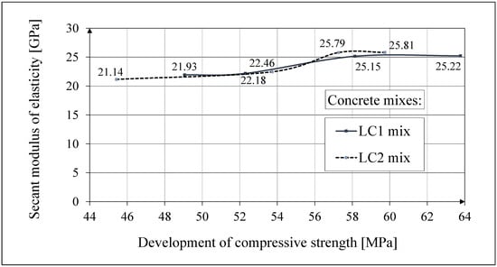 The determined expanded uncertainty of the measurement (U) of the secant modulus of elasticity given in percentage terms did not exceed the values of 2.03% for LC1 concrete and 1.92% for LC2 concrete. As can be easily seen, the obtained measurement uncertainty of the test results of the modulus of elasticity is very small and smaller than the coefficients of variation of the particular modules.