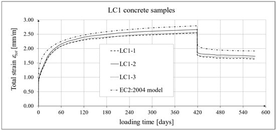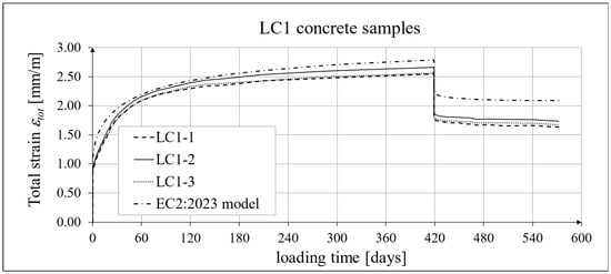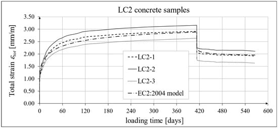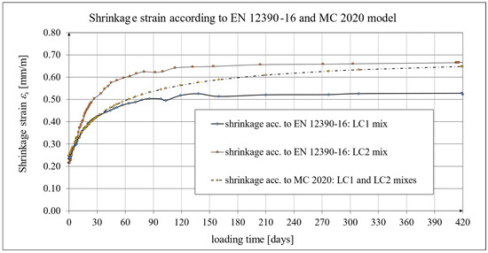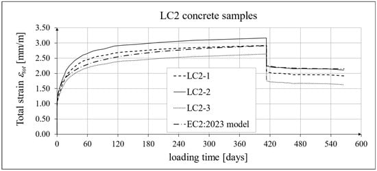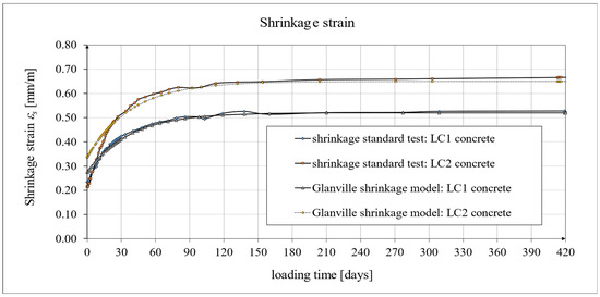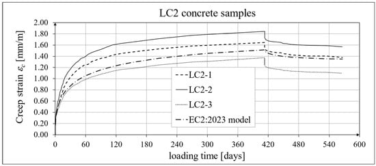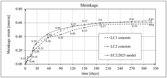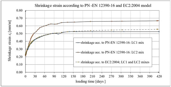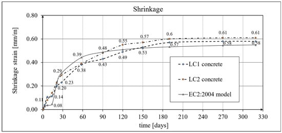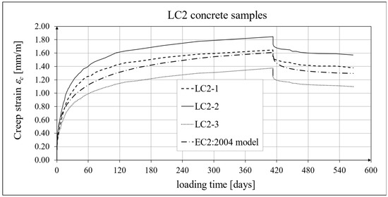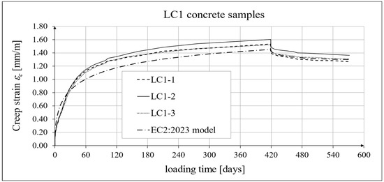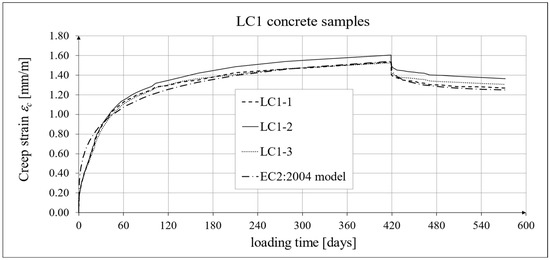 According to the experimental program, strength tests were performed after 7 and 14 days; then, after 28, 60, and 120 days; and finally, after 300 days. The shrinkage tests were carried out by the Amsler method at intervals consistent with the reference document [65], until the results stabilized). Only the secant modulus of elasticity and shrinkage development in accordance with the new standard [66] were studied for a longer period—for the purpose of creep strain testing. The entire creep deformation tests were carried out on six stands in creep-testing machines for 1050 days for LC1 concrete and 1044 days for LC2 concrete; however, in the present work, only the first loading and unloading are described. In addition, shrinkage was tested according to EN 12390-16 [66] in the same period of time. The conducted tests allowed us to determine the above-mentioned short-term and long-term parameters of concrete samples with lightweight sintered aggregate.