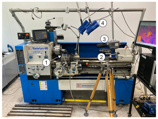 The test stand: 1—a piezoelectric dynamometer, 2—a thermovision camera, 3—a high-speed camera, 4—the lighting system.