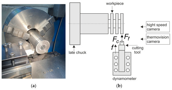 The fixing of the dynamometer and the cutting tool is shown in Figure 4a. The orthogonal turning was performed at a constant cutting speed on a suitably prepared shaft. Two cutting force components, and , which were the temperature in the cutting zone and the process of the chip formation and flow, were recorded during the tests, in accordance with the diagram in Figure 4b.
