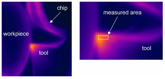 Figure 7 presents an example of the thermovision image with a rectangle area. Based on the literature, the emissivity for the uncoated WC-Co tool was assumed to be ε = 0.48 [33]. Studies with a similar setup for contactless temperature measurement are described in [34].