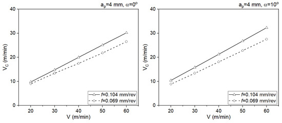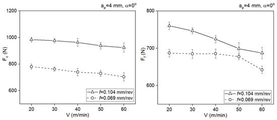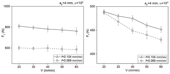Impact of the cutting speed on the values of the cutting force components Fc and Ff, ap = 4 mm, α = 10°.
