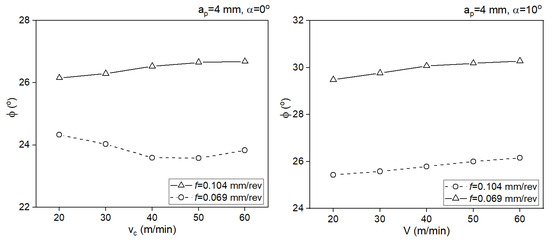 Impact of the cutting speed on the shear angle for two rake angle values.