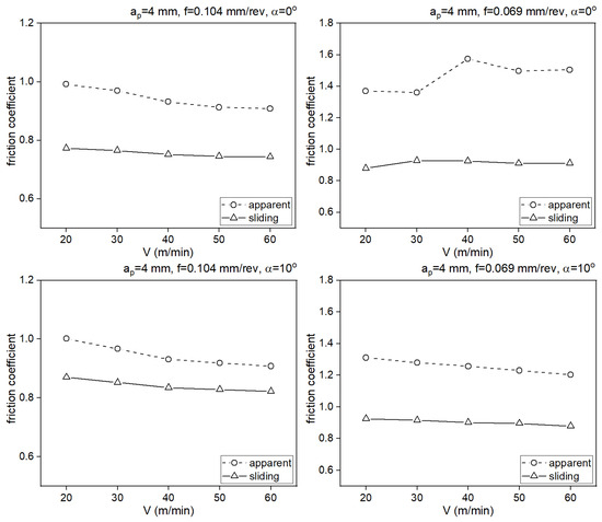 Impact of cutting speed on values of sliding friction coefficient and apparent friction coefficient.
